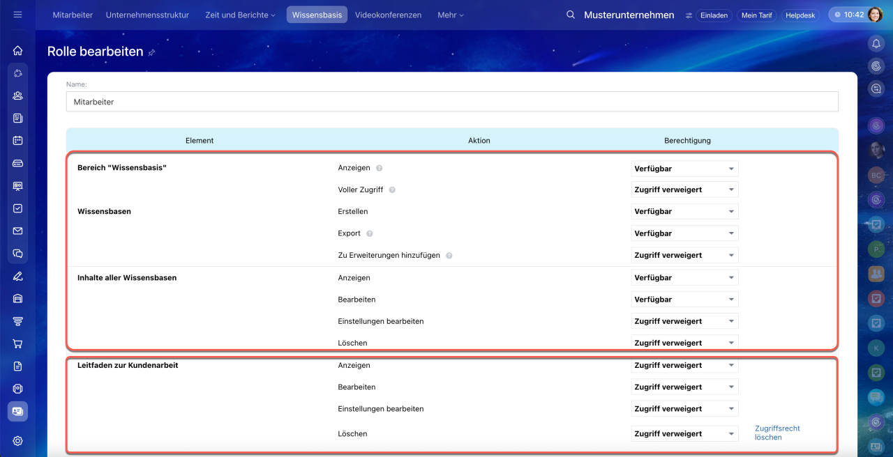 - Die Zugriffsrechte können Sie für den Bereich Wissensbasis und für einzelne Wissensbasen des Unternehmens, der Gruppen und Projekte einrichten.