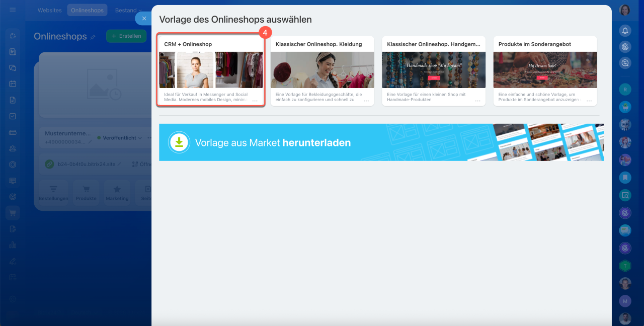 Aus dem Bereich Websites und Onlineshops. Öffnen Sie den Bereich Websites und Onlineshops > Onlineshops > Erstellen. Wählen Sie die Vorlage CRM + Onlineshop und klicken Sie auf Erstellen Sie Ihren eigenen Onlineshop mit wenigen Klicks.