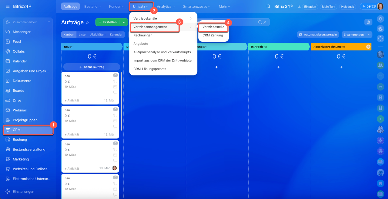 Öffnen Sie den Bereich CRM > Umsatz > Vertriebsmanagement > Vertriebsstelle.