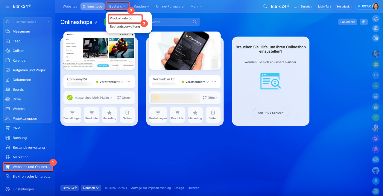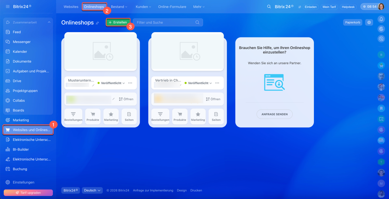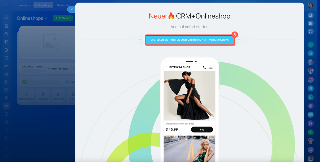 - Der Onlineshop kann in wenigen Minuten über CRM > Umsatz > Vertriebskanäle > Contact Center oder über Websites und Onlineshops > Onlineshops erstellt werden.