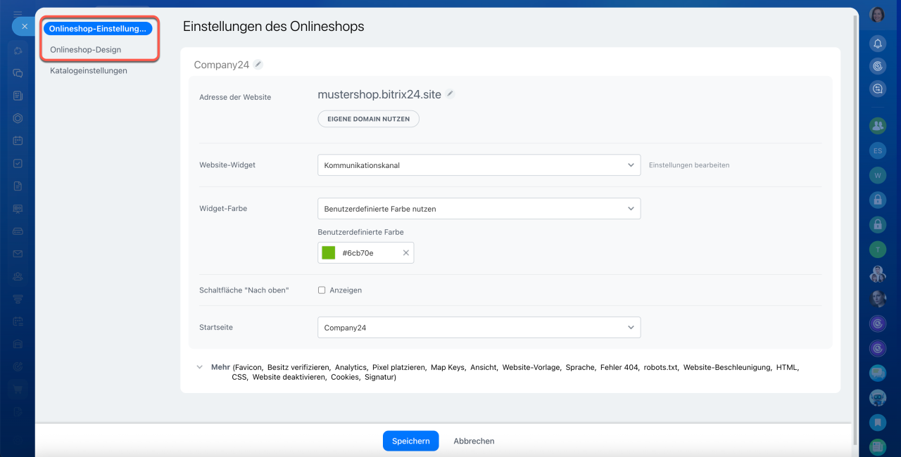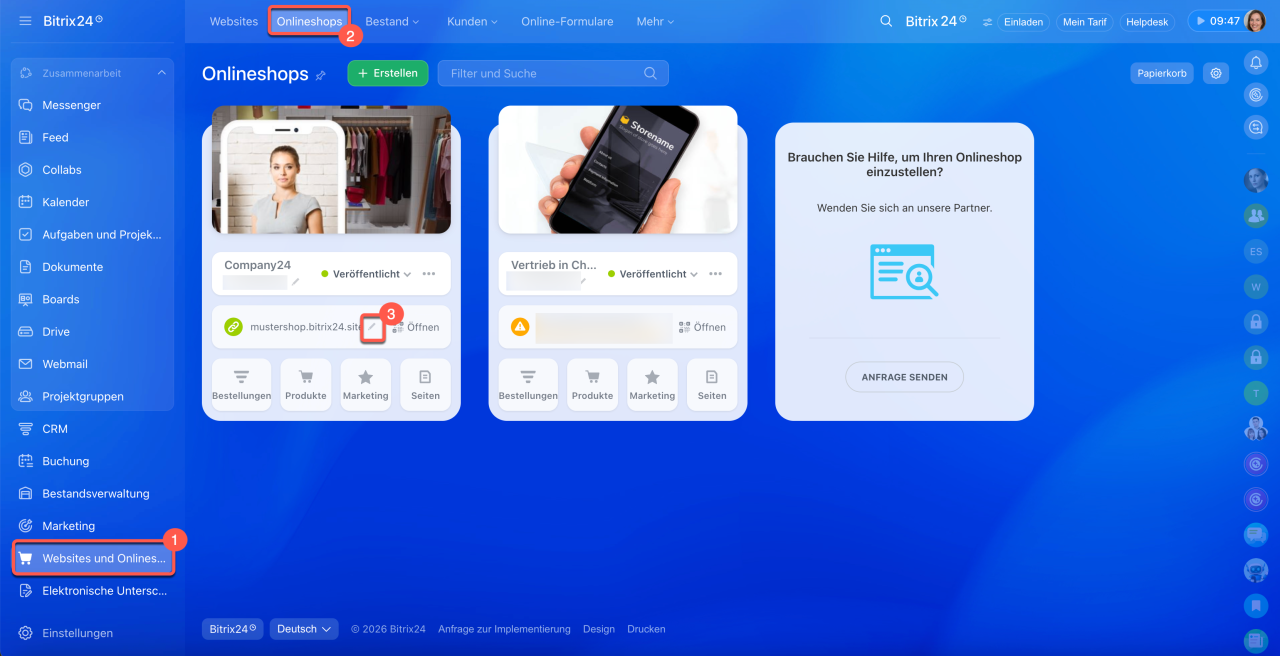 Nach der Einrichtung des Onlineshops können Sie mit der Promotion beginnen. Standardmäßig erhält der Onlineshop eine Adresse auf einer Bitrix24-Subdomain. Später können Sie eine eigene Domain verbinden.