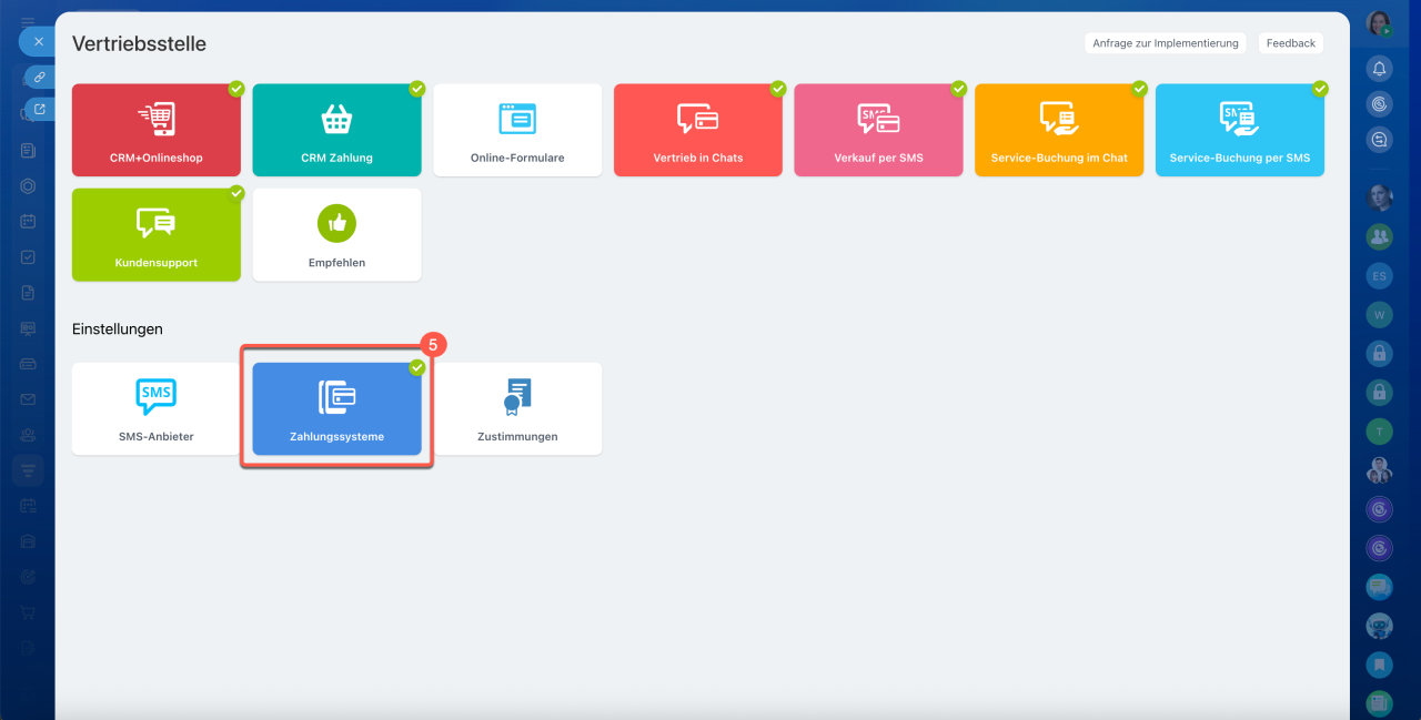 Öffnen Sie den Block Zahlungssysteme und verbinden Sie die Zahlungsmethoden, die für Kunden verfügbar sein sollen.