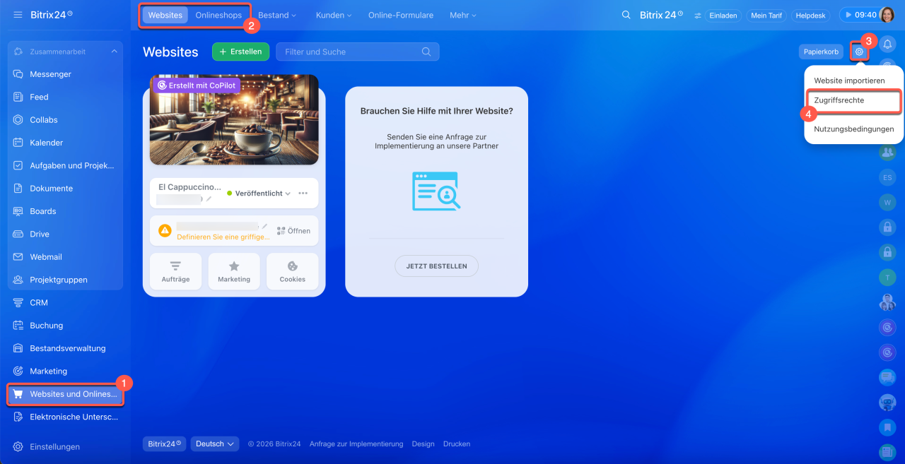 Öffnen Sie den Bereich Websites und Onlineshops und wechseln Sie zum Tab Websites oder Onlineshops. Klicken Sie oben rechts auf Einstellungen (⚙️) und wählen Sie Zugriffsrechte.