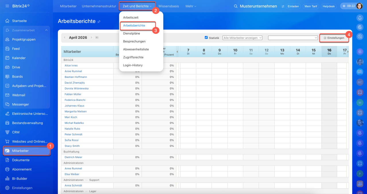 1–3. Öffnen Sie den Bereich Mitarbeiter > Zeit und Berichte > Arbeitsberichte.