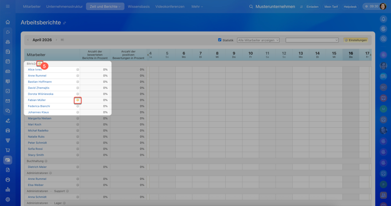- In der Liste sind die Berichte je nach Bewertung der Führungskraft farblich hervorgehoben. Dies ermöglicht es, schnell zu erkennen, welche Mitarbeiter pünktlich berichtet haben, und bei Bedarf direkt zu den entsprechenden Berichten zu wechseln.