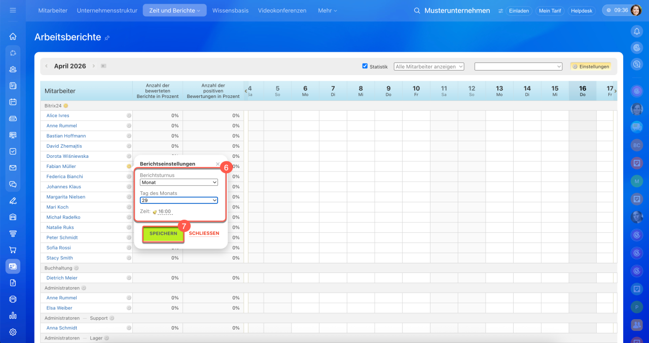 Bei der Konfiguration können Sie festlegen, wer Berichte senden soll und in welchem Rhythmus. Sie können Berichte für eine gesamte Abteilung oder für einzelne Mitarbeiter einrichten. So kann beispielsweise ein Mitarbeiter tägliche Berichte einreichen, während andere wöchentliche Berichte erstellen.