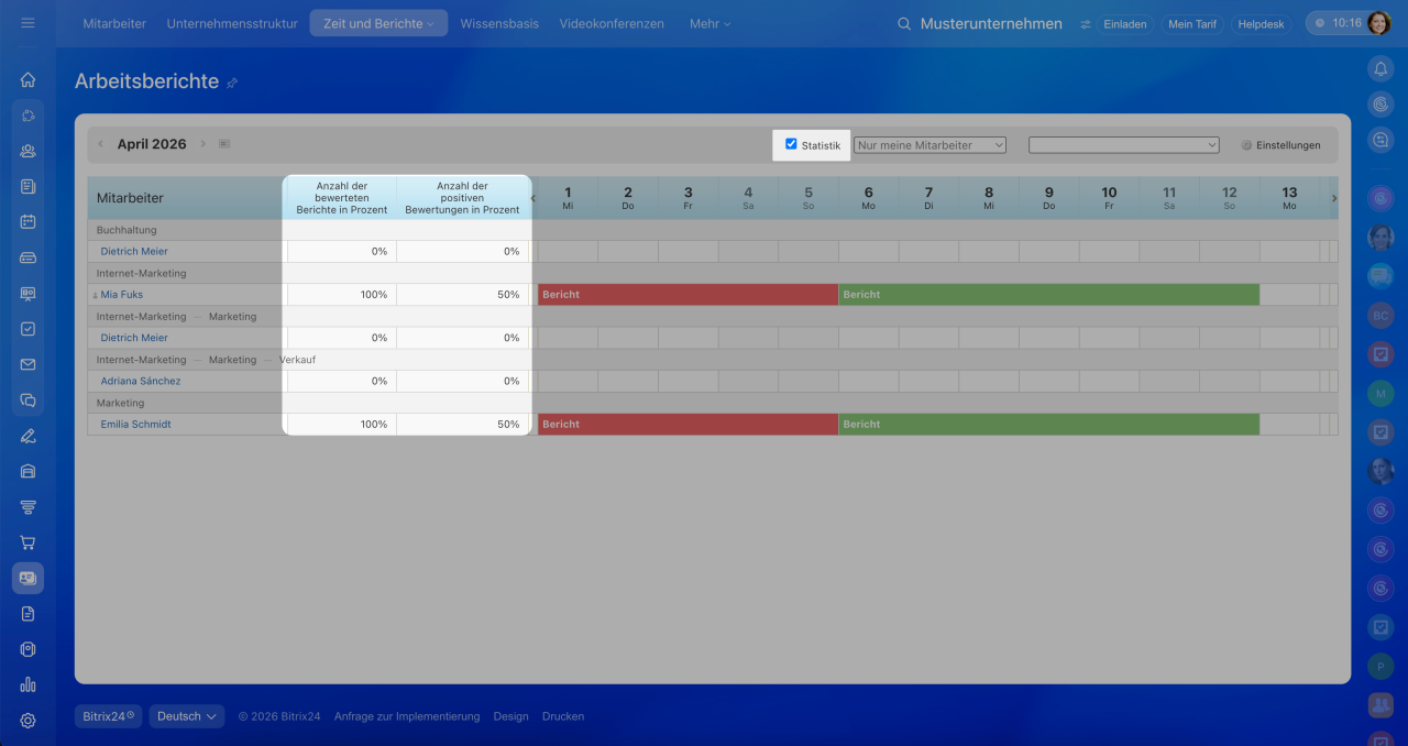 Um Statistiken in den Berichten anzuzeigen, aktivieren Sie das Kontrollkästchen. In der Liste erscheinen dann zwei zusätzliche Spalten: der Prozentsatz der bewerteten Berichte und der Prozentsatz der Berichte mit positiver Bewertung. Beispiel: Wenn die meisten Berichte eines Monats positiv bewertet wurden, deutet dies darauf hin, dass die Mitarbeiter ihre Aufgaben erfolgreich erledigen. Bei einem niedrigen Prozentsatz sollte der Grund dafür analysiert werden.