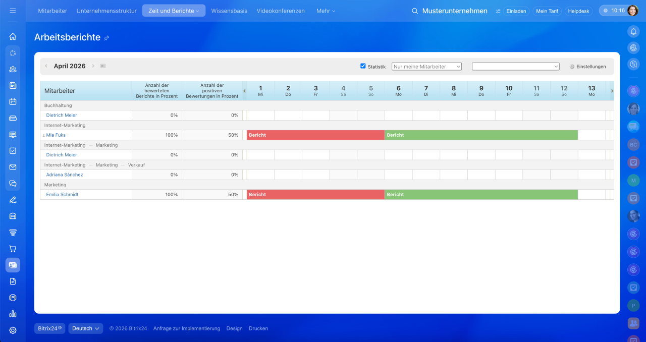 - Arbeitsberichte in Bitrix24 helfen Vorgesetzten, die Aufgaben des Teams und mögliche Verzögerungen effektiv zu überwachen, sowie Mitarbeitern, rechtzeitig Feedback zu ihrer Arbeit zu erhalten.