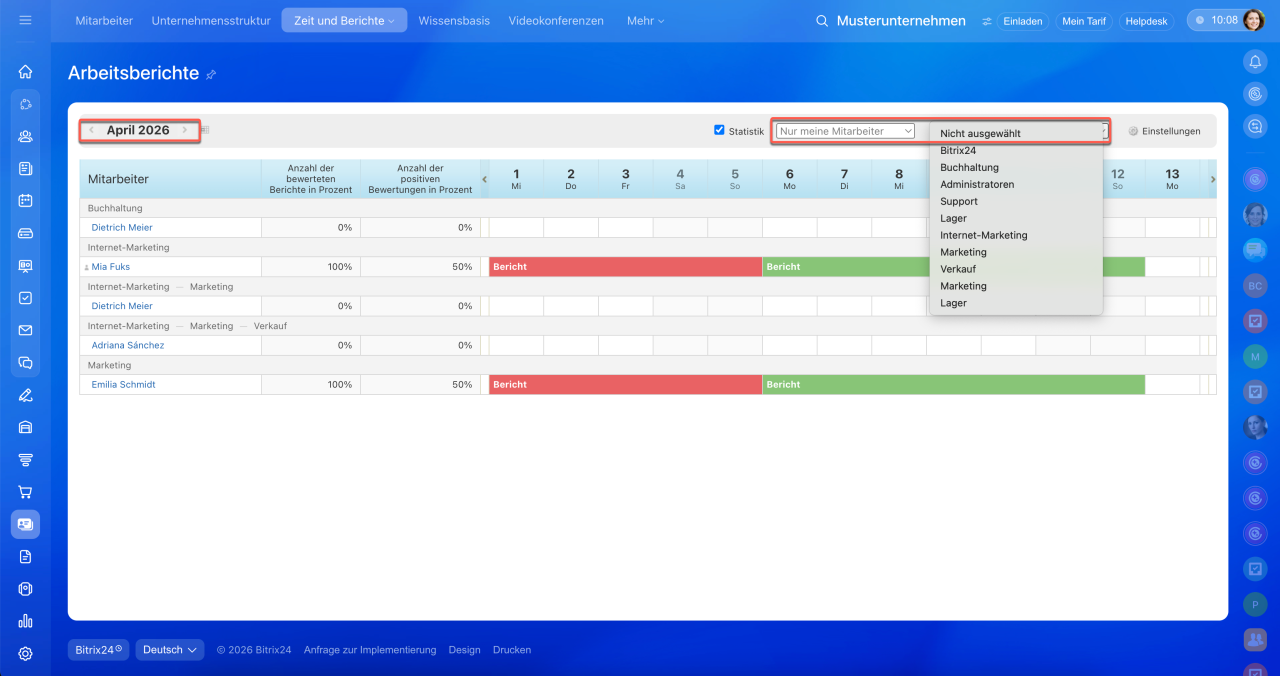 Arbeitsberichte können nach Abteilungen gefiltert werden. Diese Funktion steht dem Bitrix24-Administrator sowie Mitarbeitern mit entsprechenden Zugriffsrechten zur Verfügung – Vorgesetzten, der Personalabteilung oder Nutzern mit vollem Zugriff.