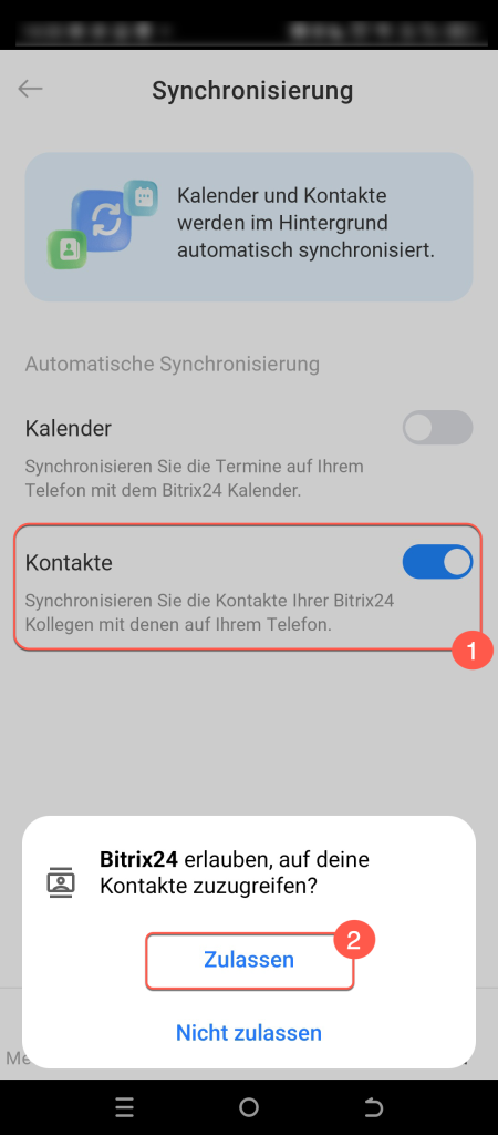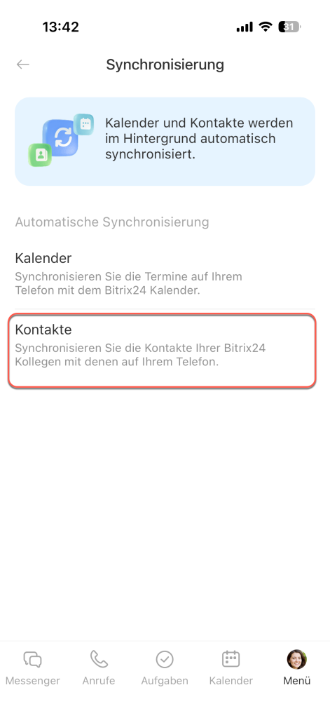 Synchronisation mit den Kontakten: Aktivieren Sie die Option Kontakte. Die App fordert Zugriff auf die Telefonkontakte an – gewähren Sie diesen Zugriff. Danach erscheinen die Kontakte der Mitarbeiter aus Bitrix24 im Telefonadressbuch. Kontakte vom Gerät werden nicht in Bitrix24 übertragen.