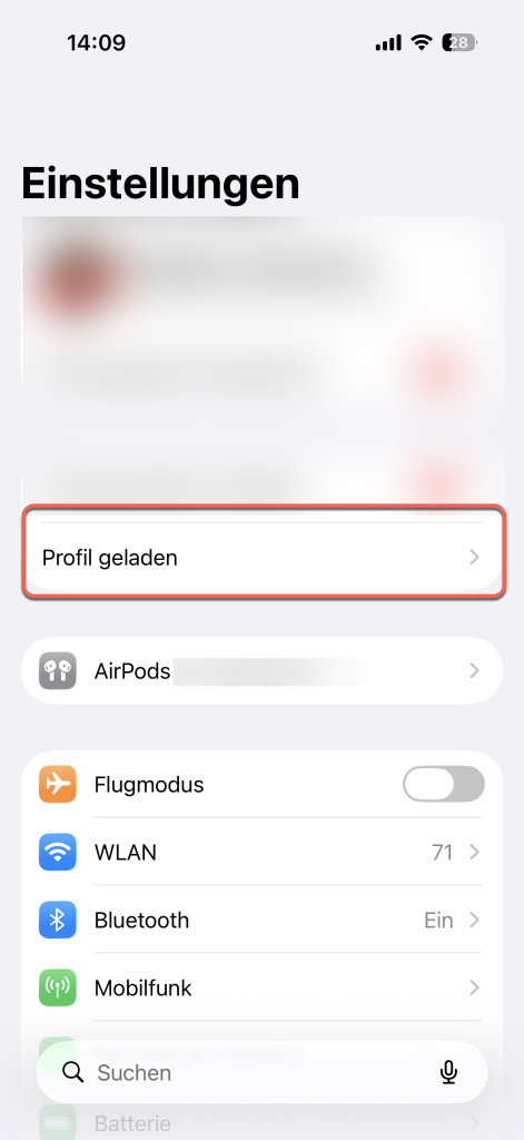 Öffnen Sie anschließend die Einstellungen Ihres iPhones. Tippen Sie auf Profil geladen.