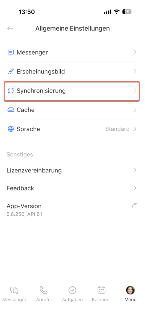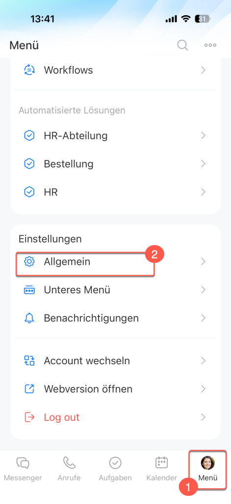 Öffnen Sie in der mobilen Bitrix24-App den Tab Menü unten rechts. Tippen Sie im Block Einstellungen auf Allgemein.