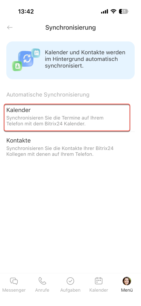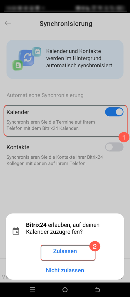 Synchronisation mit dem Kalender: Aktivieren Sie die Option Kalender. Die App fordert Zugriff auf den Telefonkalender an – gewähren Sie diesen Zugriff, da die Synchronisation sonst nicht funktioniert. Danach werden Termine aus Bitrix24 im Telefonkalender und Termine aus dem Telefonkalender in Bitrix24 angezeigt.