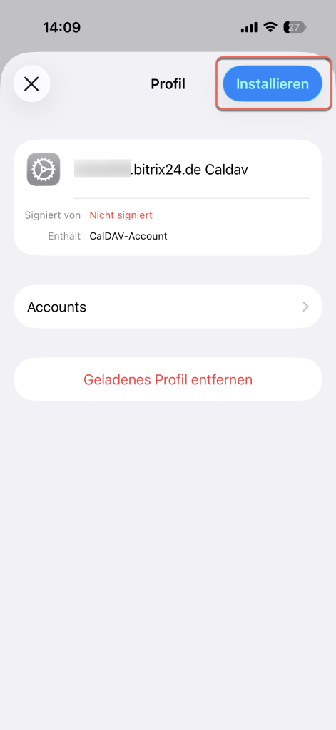 Tippen Sie oben rechts auf Installieren und folgen Sie den Anweisungen auf dem Bildschirm. Nach der Installation des Profils werden Termine aus Bitrix24 im Telefonkalender und Termine aus dem Telefonkalender in Bitrix24 angezeigt.