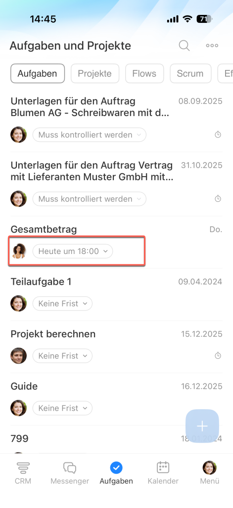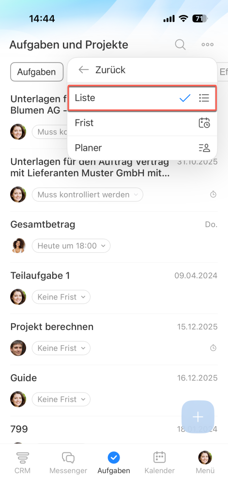 Im Modus Liste werden alle Aufgaben mit den wichtigsten Parametern angezeigt: Name, Fristen und Aktivität. Dies ist praktisch, wenn Sie eine Aufgabe schnell finden, die Liste sortieren oder eine Aktion ausführen möchten, ohne die Aufgabe zu öffnen.