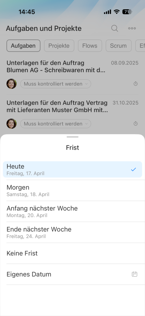 Um die Frist zu ändern, ohne die Aufgabe zu öffnen, tippen Sie auf das Datum.