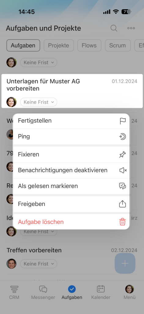 Halten Sie eine Aufgabe gedrückt, um das Aktionsmenü zu öffnen. Wählen Sie die gewünschte Aktion aus.