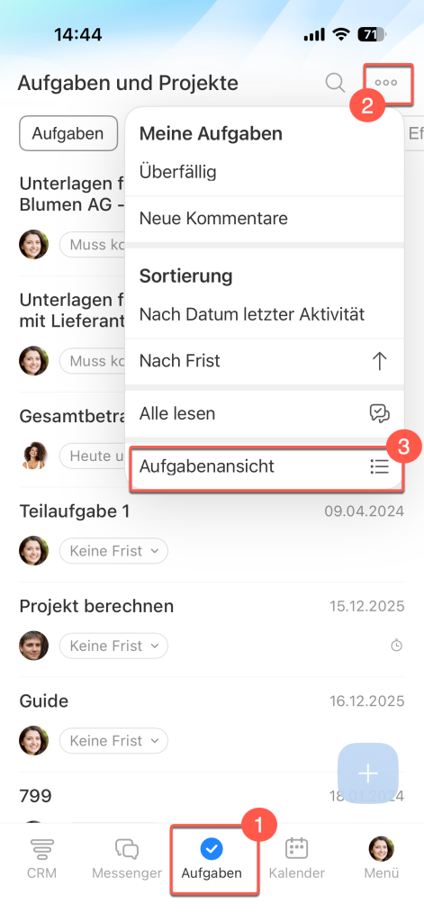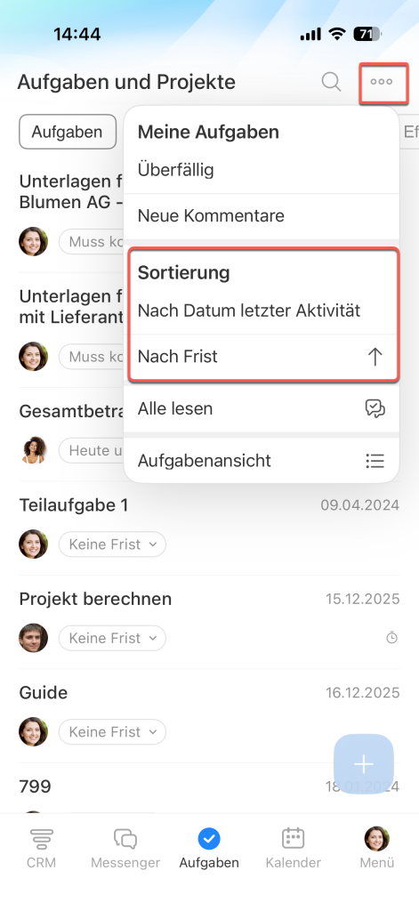 Standardmäßig sind Aufgaben nach Aktivität sortiert: Oben stehen die Aufgaben mit den letzten Änderungen. Um die Reihenfolge anzupassen, tippen Sie auf Drei Punkte (...) und wählen Sie Nach Frist.