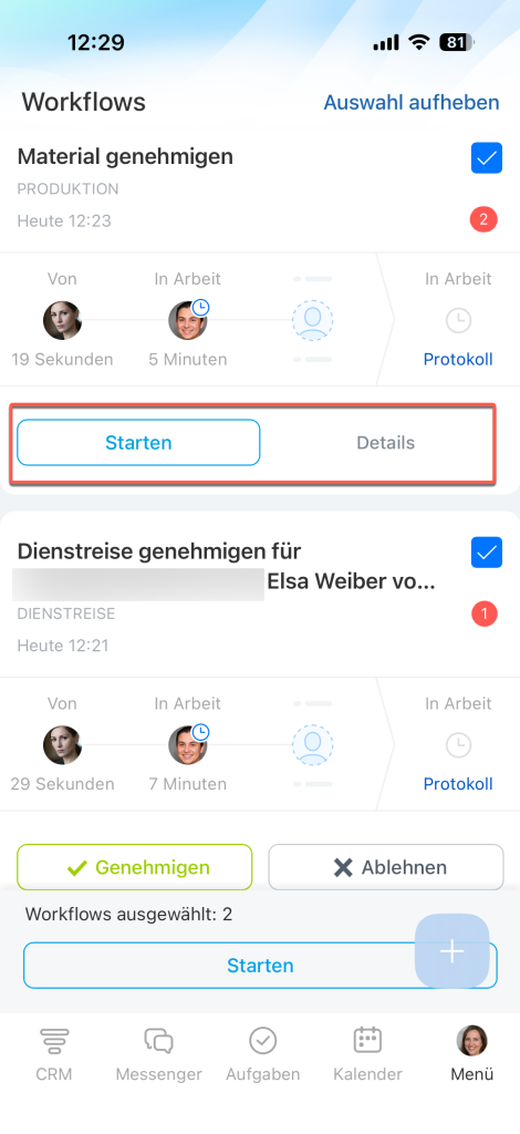 Aufgaben verschiedener Typen: zum Beispiel einen Urlaub genehmigen und eine Rechnung freigeben. Tippen Sie auf Beginnen. Die Workflows werden nacheinander geöffnet.