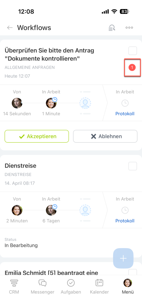 Wenn in einem Unternehmen ein Workflow gestartet wird, erhalten die Teilnehmer Workflow-Aufgaben, zum Beispiel einen Einkauf zu genehmigen, ein Dokument zu prüfen oder einen Urlaub zu genehmigen. Diese Aufgaben können direkt in der mobilen App erledigt werden.