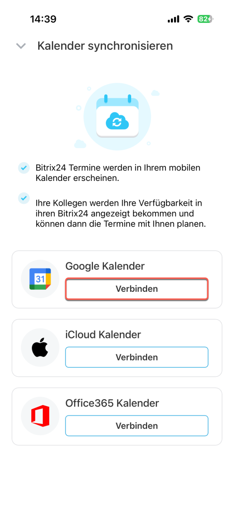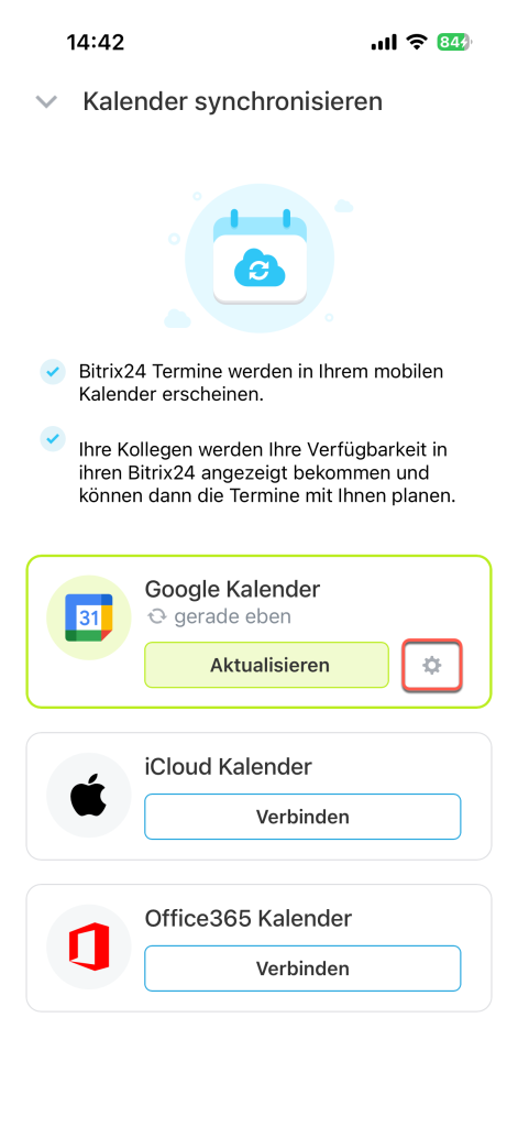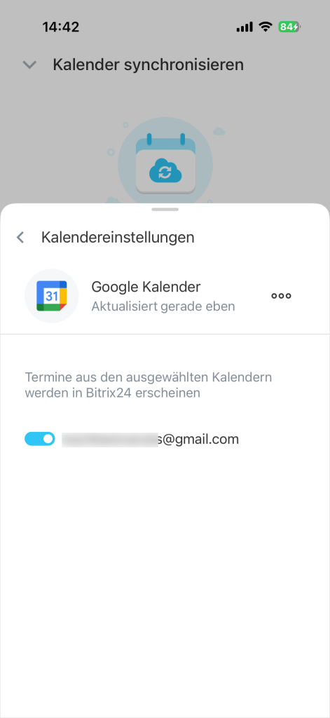 Termine aus Google Kalender werden nicht mehr in Bitrix24 angezeigt. Der bei der Synchronisierung erstellte Bitrix24-Kalender bleibt in Ihrem Google-Konto erhalten. Sie können den Kalender manuell löschen – das hat keine Auswirkungen auf Ihre Daten in Bitrix24.