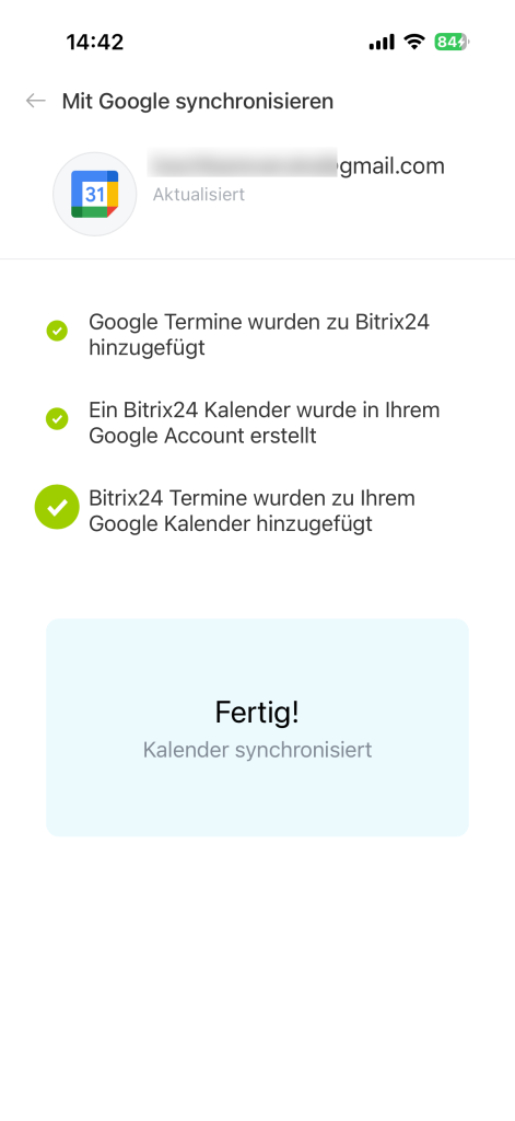 Warten Sie, bis die Synchronisierung abgeschlossen ist. Anschließend werden Termine aus Google Kalender in Bitrix24 und umgekehrt angezeigt. In Ihrem Google-Konto wird automatisch ein Bitrix24-Kalender mit Ihren Arbeitsterminen angelegt.