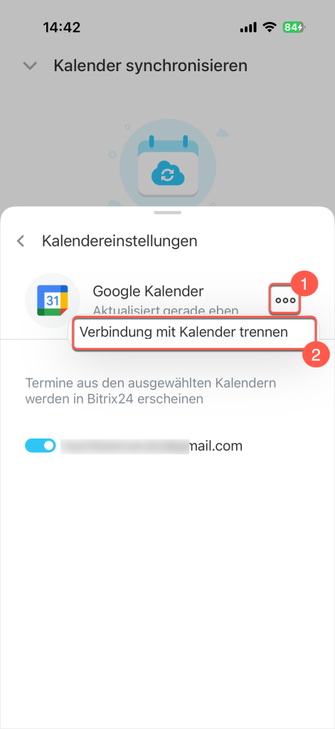 Synchronisierung deaktivieren: Tippen Sie auf das Symbol Drei Punkte (...) neben Google Kalender und wählen Sie Verbindung mit Kalender trennen aus.