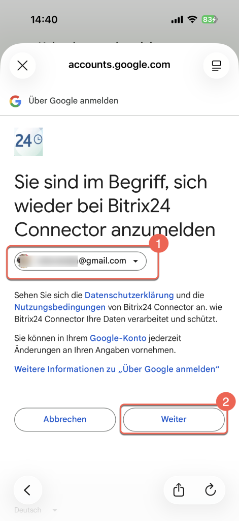 Melden Sie sich bei Ihrem Google-Konto an oder wählen Sie eines der auf dem Gerät hinterlegten Konten aus. Tippen Sie auf Weiter und folgen Sie den Anweisungen auf dem Bildschirm: Melden Sie sich in der Bitrix24 Connector-App an und erteilen Sie die erforderlichen Zugriffsrechte für Ihr Google-Konto.