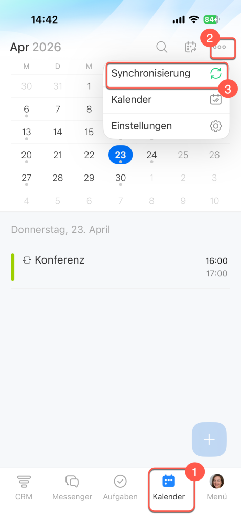 Öffnen Sie den Bereich Kalender. Tippen Sie oben rechts auf das Symbol Drei Punkte (...) und wählen Sie Synchronisierung aus.
