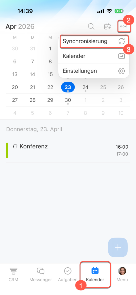 Öffnen Sie den Bereich Kalender entweder über die untere Leiste der App oder über den Punkt Menü. Tippen Sie oben rechts auf das Symbol Drei Punkte (...) und wählen Sie Synchronisierung aus.